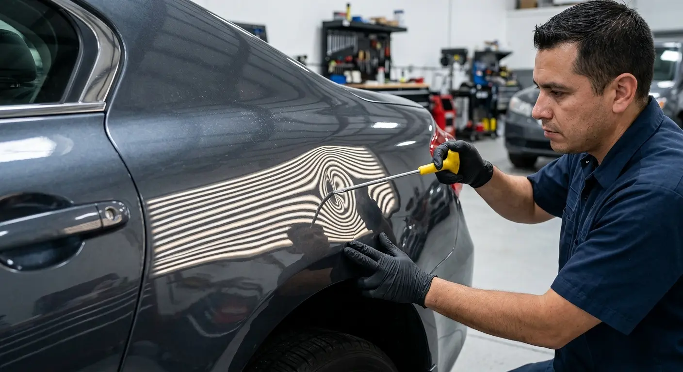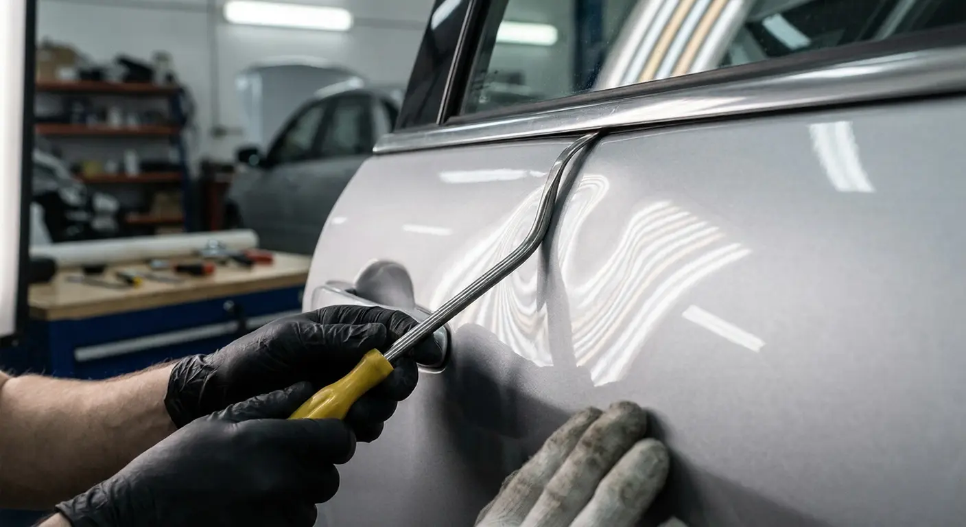 Professional removal of various types of vehicle dents using specialized tools. This process restores the smooth lines of your car's exterior, whether the damage is from a minor door ding or a larger impact.